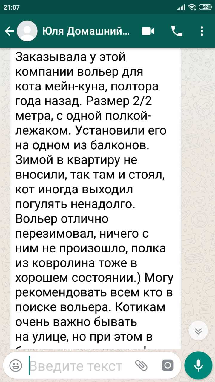Заказывала у этой компании вольер для кота мейн-куна, полтора года назад. Размер 2/2 метра, с одной полкой-лежаком.